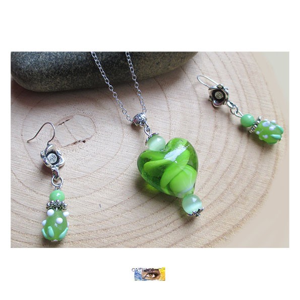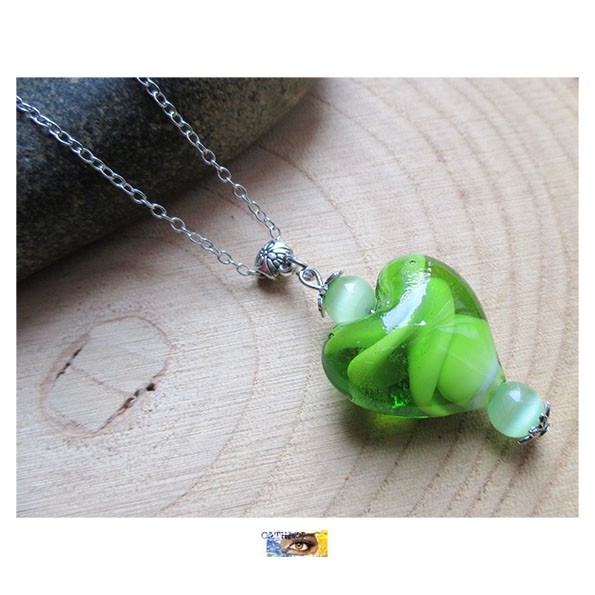 ♥ Chaîne Pendentif - "Cœur" Verre Murano, perles œil de chat - Chaine Métal argent ♥