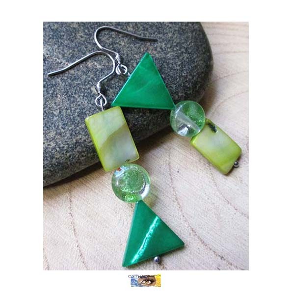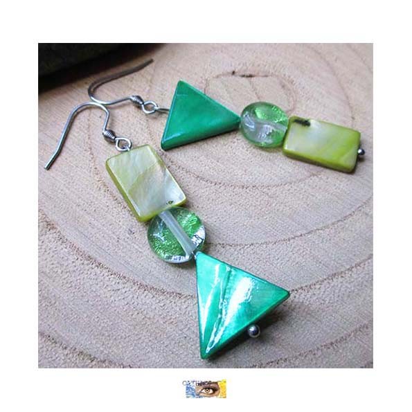 ♥ B.O. Asymétrique "Géométrie" Nacre verte et œil de chat- Acier inoxydable ♥