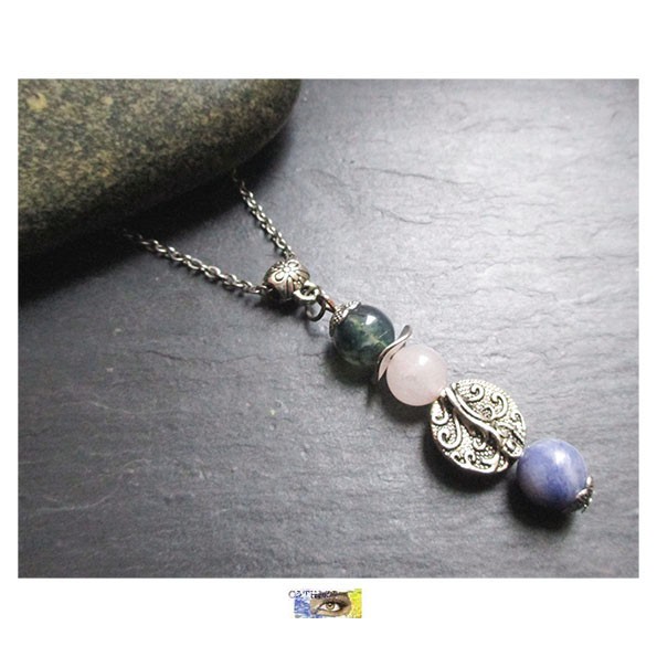 Pendentif - "Confiance en soi-Courage"- Agate mousse, Quartz rose, Sodalite - Métal argent + Bélière 2Confiance En Soi